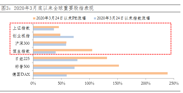 二、如果真的“杀估值”、“比谁差”,会怎样?对比A股和美股在00年科网泡沫、08年金融危机及当前的估值水平,相比美股估值创新高,A股估值则位于“洼地”,所以如果真的“杀估值”, A股更具有“安全垫”。此外,对比2020年3月底以来全球重要股指表现,真是感觉外面很乱,唯有国内好。欧、美、日股市的估值涨幅远远超过指数涨幅,其“虚胖”的体质或更易“摇摇欲坠”。