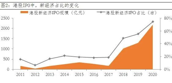 2013年,港交所因不允许“同股不同权”而错失阿里巴巴的上市,之后经过多年努力,2018年修改了上市新规,不仅接受“同股不同权”,还允许没有盈利甚至没有收入的生物科技公司赴港上市。看港股的IPO数据,“新经济”在2017年只是“冰山一角”,但2018年就占据“半边天”,2020年更是成为“主力军”。