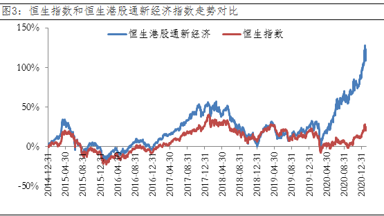 注:新经济主要指新业态、新产业、新模式,统计是结合统计局对“三新”的行业界定,按照港交所三级行业指数划定,涉及30个子行业,数据来源:wind,截至2020年12月31日。