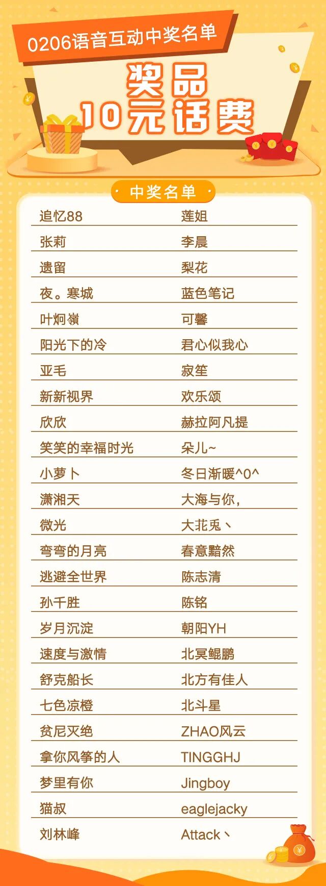 话费将于2月10日(本周三之前)充值到中奖客官后台预留的手机号码中,请各位客官耐心等待~