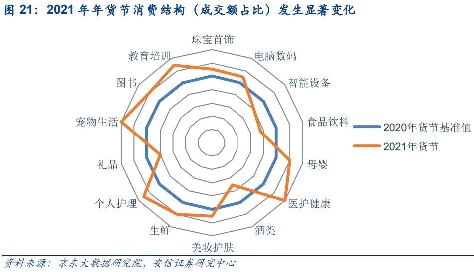 (2)消费结构上,居民消费呈现出对品牌、非必须类享受型消费品的需求增加上。根据京东大数据研究院的数据,2021年年货节中宠物生活、医护健康、教育培训等类别消费相比去年有较大幅度提升,而食品饮料、酒类、礼品等消费占比则有一定下滑。
