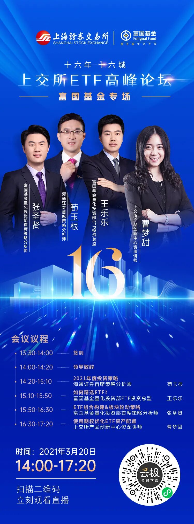 2021年3月20日,我们相约线上直播,在上交所联合富国基金等公募基金公司举办的“十六年十六城”ETF高峰论坛上,探讨行业发展趋势、交流长期投资、价值投资理念,以期推动行业的持续发展。
