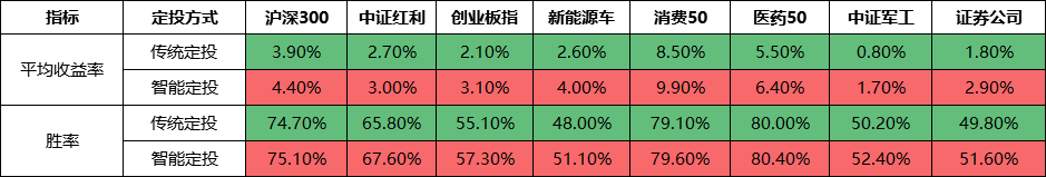 我们把这225份定投样本,分别应用在“传统定投”和“智能定投”两种策略上、和8个主要指数上,计算平均收益率和胜率,发现: