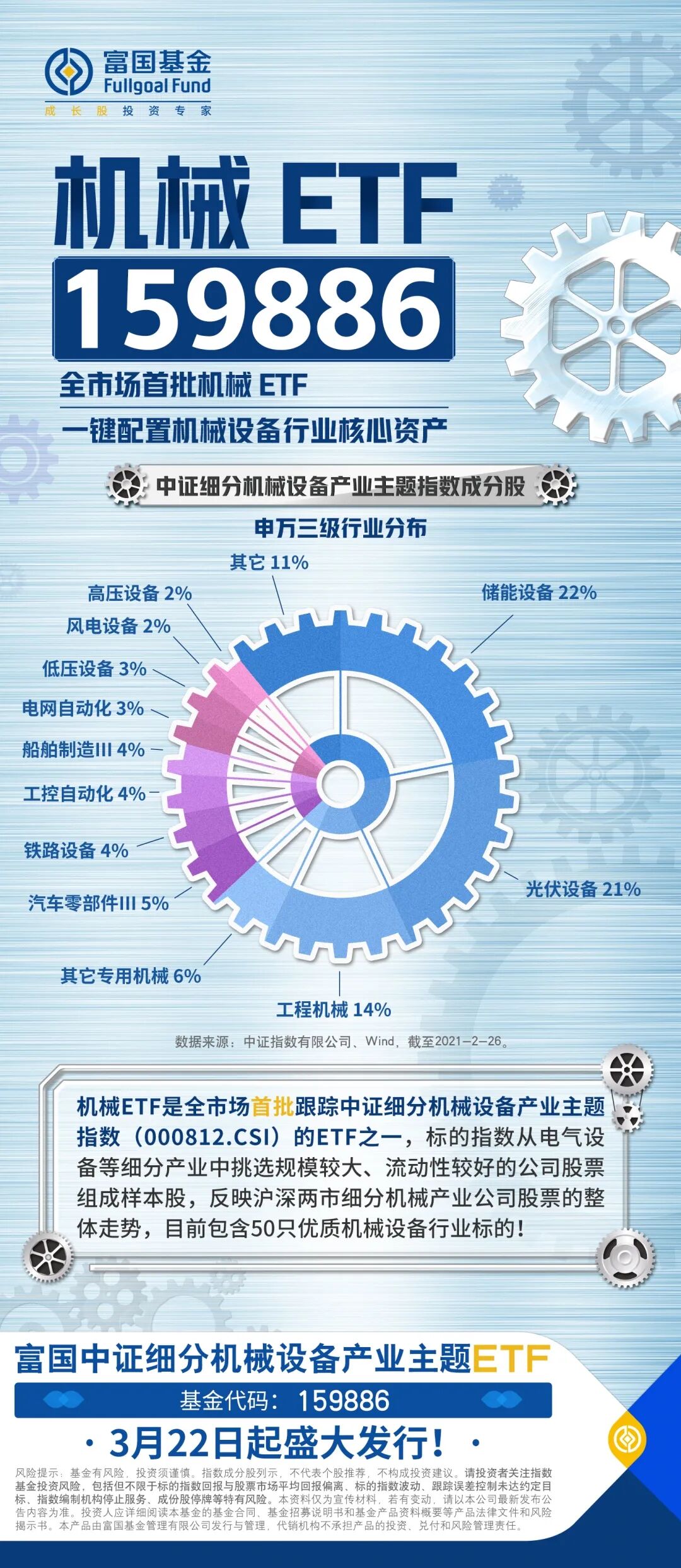 今日,全市场首批机械设备类ETF:富国中证细分机械设备产业主题ETF(场内简称:机械ETF,基金代码:159886)盛大首发,该产品拟由富国量化投资部量化投资副总监蔡卡尔管理,其具备7年基金从业经历,为投资者提供了一键配置行业核心价值的机会。