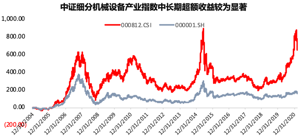 自2004年12月31日基日以来,截至2021年3月19日,中证细分机械设备产业主题指数(000812.CSI)涨幅为672.8%,同期上证综指涨幅167.3%,超额收益达505.5%。