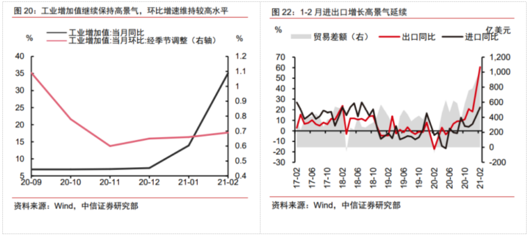 1) 1、2月份经济稳步复苏。1-2月规模以上工业增加值比2019年同期增长16.9%,为近年来同期较高水平。固定资产投资稳定增长,进出口增势比较快,1-2月份货物进出口总额比2019年同期增长19.3%。