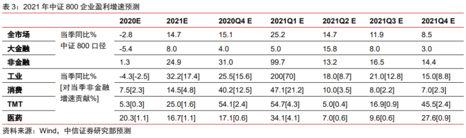 2) 4月为A股上市公司年报和一季报的密集披露期。中信证券认为,站在当前时点,工业/消费/TMT/医药单季度净利润增速预计达到200%/47.1%/54.7%/34.1%,其中工业将成为一季度盈利弹性最大的板块。
