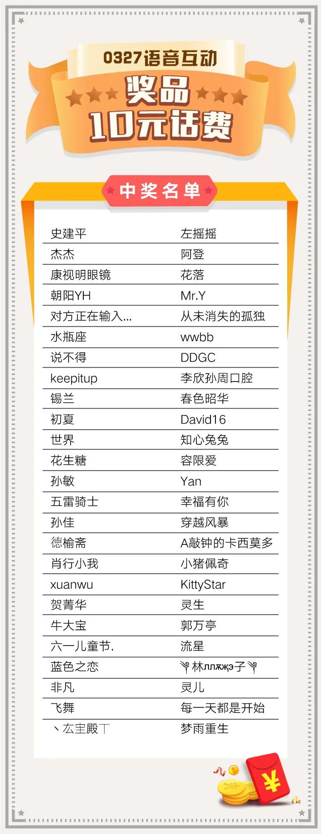 话费将于4月2日(本周五之前)充值到中奖客官后台预留的手机号码中,请各位客官耐心等待~