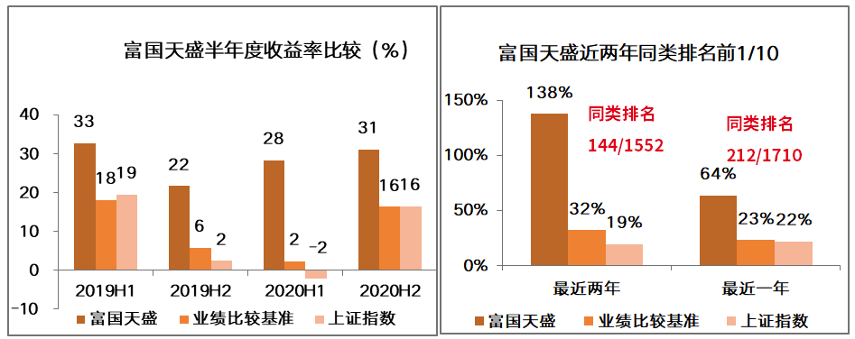 注2:富国天盛(2014年4月30日成立)2016-2020年度基金份额净值增长率与其同期业绩比较基准收益率(沪深 300 指数收益率×65%+中债综合指数收益率×35%)分别为-10.63%(-6.37%)、29.16%(13.89%)、 -18.89%(-14.51%)、 61.32%(24.65%)、67.94%(18.86%),数据来源∶基金定期报告,截至2020年12月31日。袁宜自2014年4月至2018年9月担任本基金基金经理,肖威兵自2018年9月开始担任本基金基金经理。