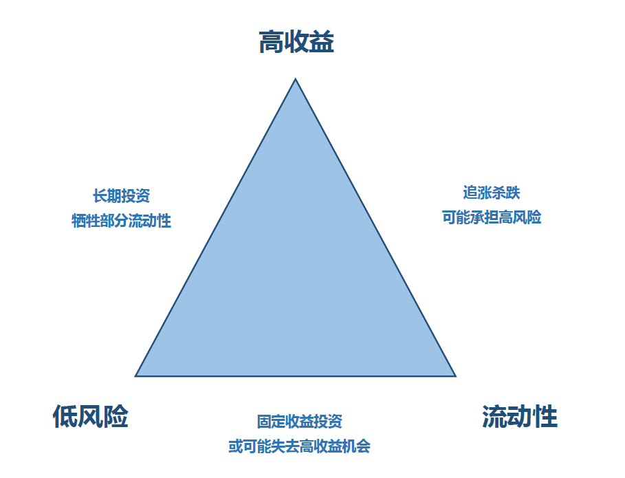应用到投资中,“不可能三角”即为高收益、低风险、流动性。
