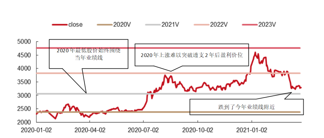 而在市场情绪不好的时候,行业价格一般也会反映当年的业绩,如果我们发现,某行业的价格正好在当年业绩线附近,那么可能就意味着机会。