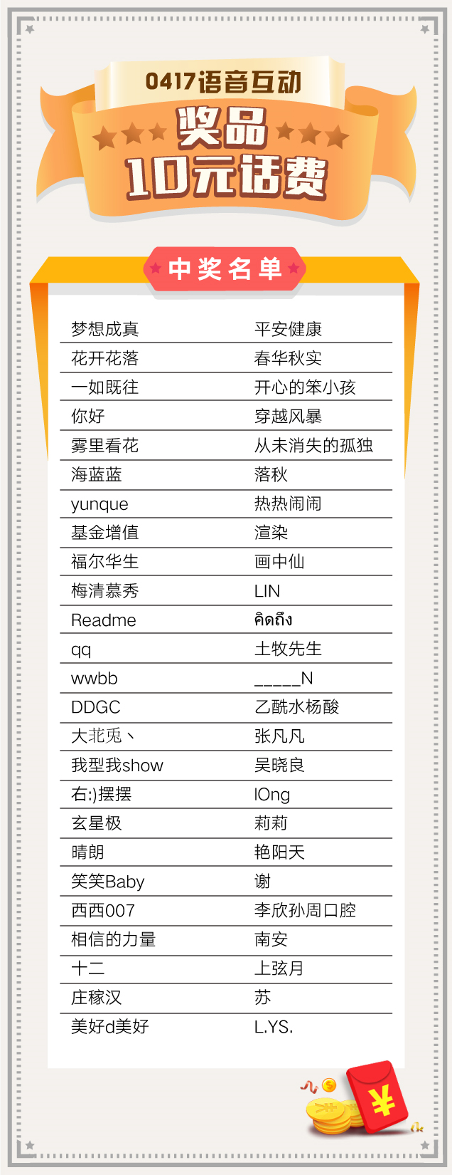 话费将于4月23日(本周五之前)充值到中奖客官后台预留的手机号码中,请各位客官耐心等待~