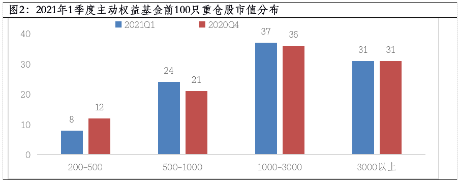 个股层面,从公募基金重仓股中的前100只个股来看,集中度依旧有所抬升,前100只个股持仓占比由41.99%升至44.07%。市值层面,并没有下沉至较小市值。去年4季度最小市值为280亿元左右,与当前基本一致,居于500亿元以下的个股占比由8只上升至12只,整体变化不大。