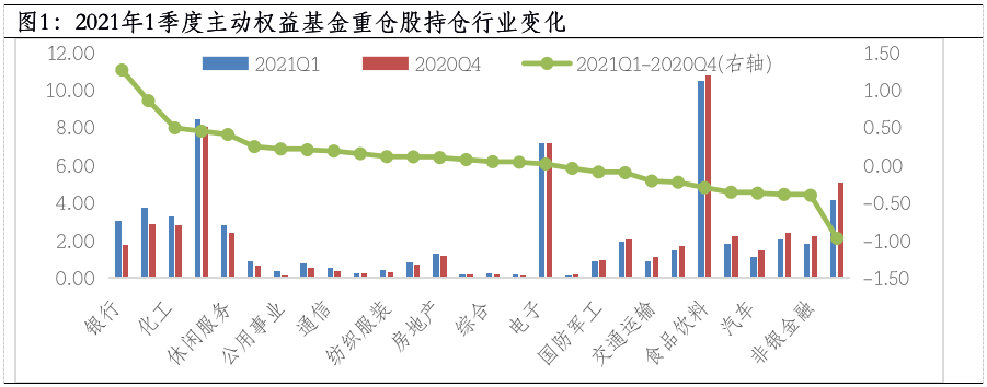 相较于去年4季度,主动偏股型基金仓位略降,由81.56%降至78.53%;行业层面(仅计算十大重仓股),存量上,食品饮料、医药生物、电子位列前三甲,电气设备、传媒紧随其后,与去年4季度一致。边际变化上,银行获得明显增持,仓位由1.79%上升至3.05%,而传媒、化工、医药、休闲服务、轻工制造分别增持0.86、0.50、0.45、0.41、0.25个百分点。而电气设备、非银金融、家用电器仓位明显回落,分别降低0.97、0.40、0.39个百分点。
