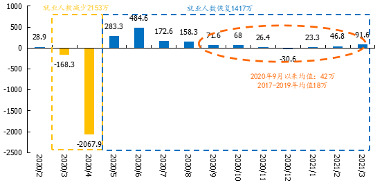 ➤ 从就业人口来看,从2020年5月美国“解封”经济、积极推进复工复产后至今,美国非农就业人数已累计增加1417万人,去年9月以来月均增加42万,远高于2017-2019年均值18万,就业复苏态势向好,但新增就业仅占受疫情冲击而萎缩的就业规模(2153万)的62%。如果要恢复到疫情前就业规模,按照月均新增90万(保持3月的新增就业人数)的乐观预期,也需要8个月时间。