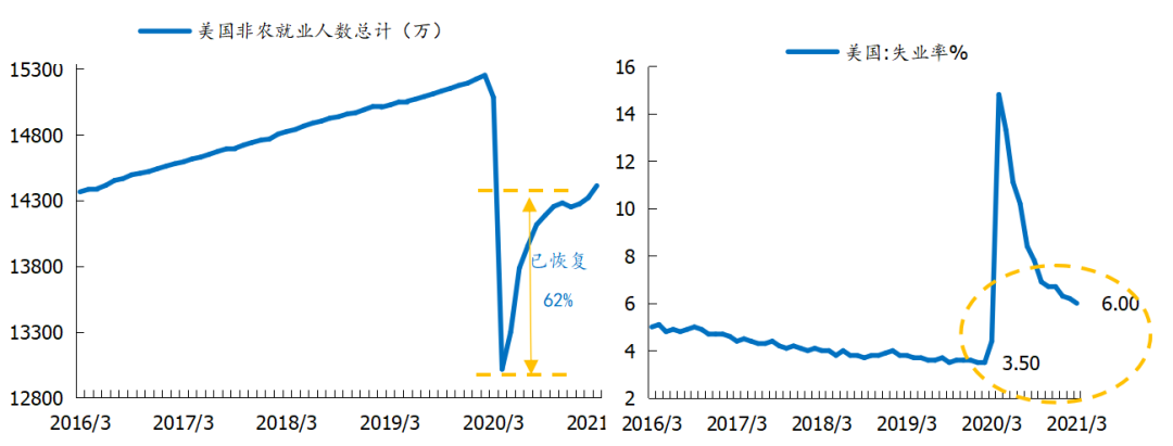 美国就业情况快速恢复,但较疫情前仍有较大差距。