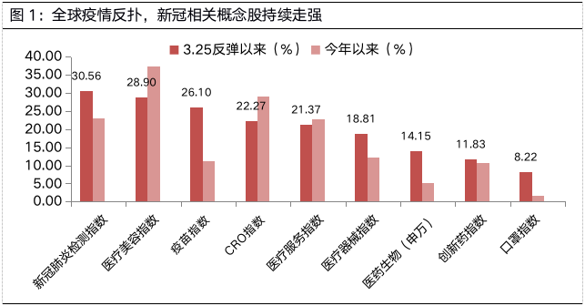 4月15日,印度单日新增确诊病例首次超20万例,截至28日已连续七天单日新增确诊病例超过30万例,成为全球新冠疫情的“风暴中心”。纵观历史,每当全球疫情反复,医药板块关注度都有所上升,只是随着新冠疫情的演变,疫情相关概念股从曾经的口罩、医疗器械领涨,逐步过渡到了本轮新冠检测、生物疫苗等子板块持续走强,近一个月这两个子板块分别上涨30.56%、26.10%。