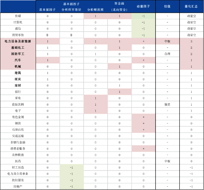 估值因子:军工在合理位置、新能源和医药处于中枢。