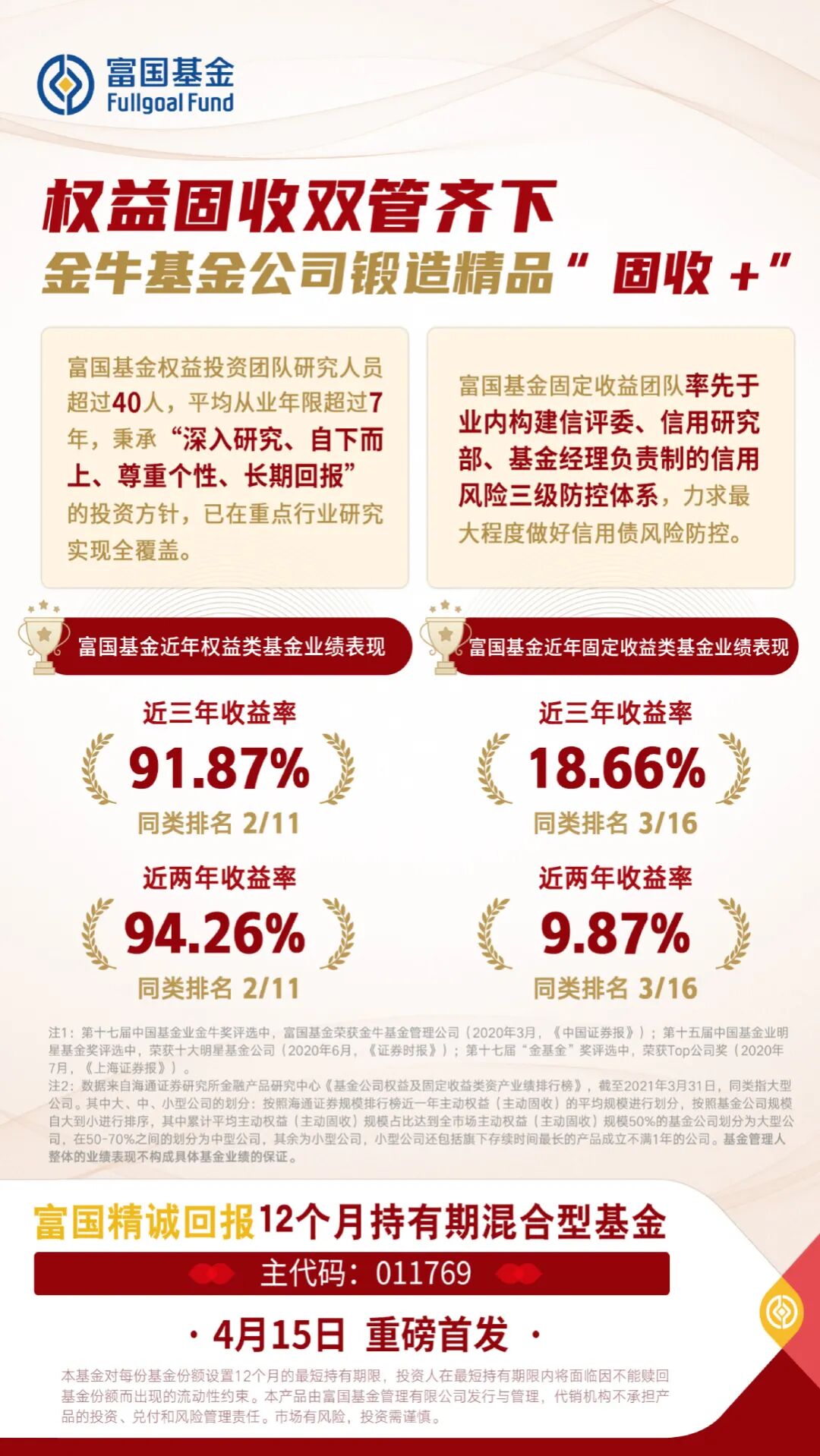 风险提示:本基金对每份基金份额设置12个月的最短持有期限,投资人在最短持有期限内将面临因不能赎回基金份额而出现的流动性约束。本产品由富国基金管理有限公司发行与管理,代销机构不承担产品的投资、兑付和风险管理责任。市场有风险,投资需谨慎。