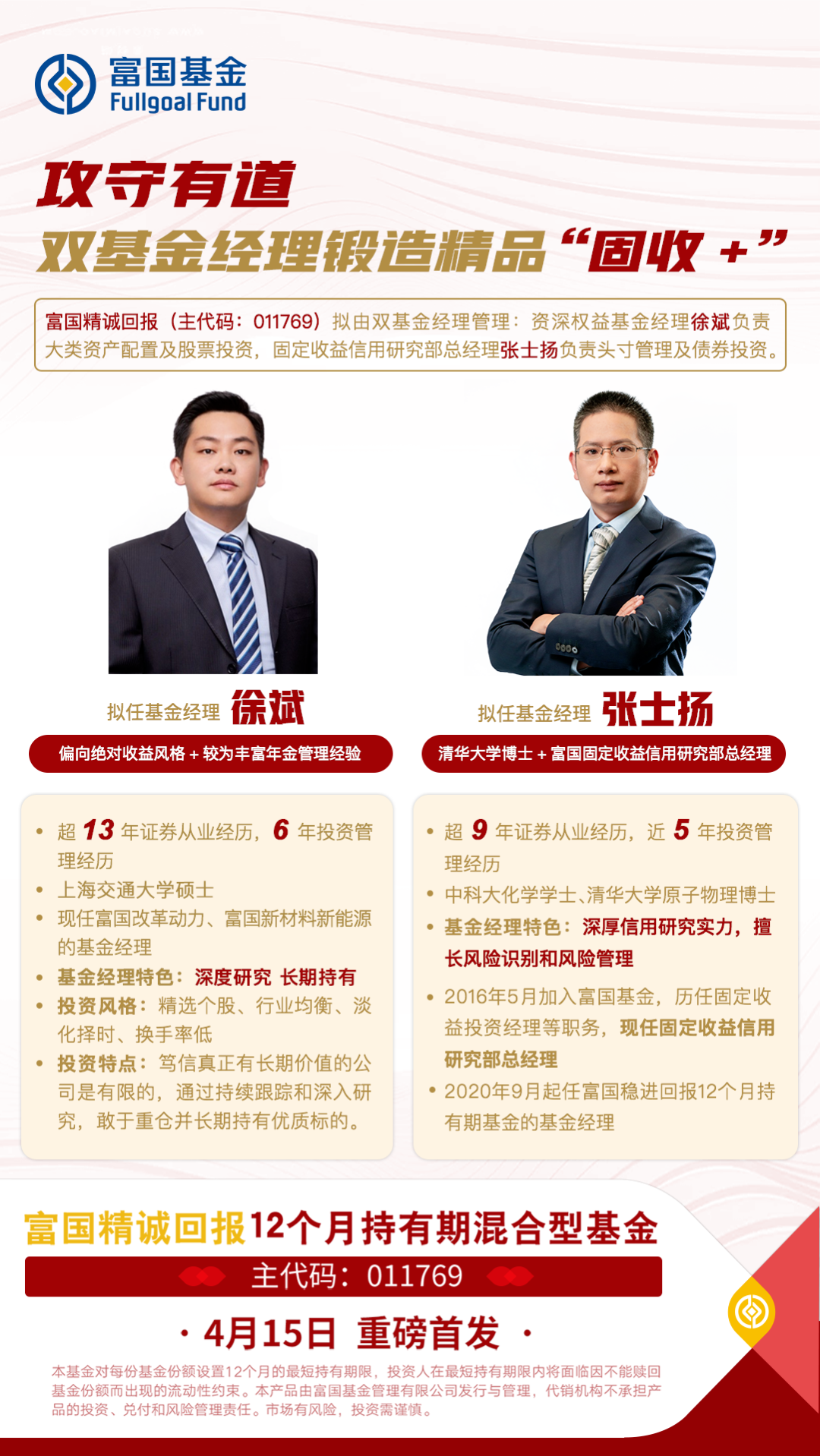 富国精诚回报将由张士扬和徐斌两位基金经理共同管理,其中张士扬作为混合双打团队中防御型选手,主要负责债券投资,徐斌作为混合双打团队中的进攻型选手,主要负责权益投资。