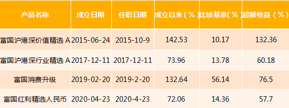 (2)富国沪港深行业精选A成立于2017-12-11,2018-2020年度基金净值增长率及同期业绩比较基准(恒生综合指数收益率*60%+中债综合全价(总值)指数*30%+沪深300指数收益率*10%)收益率为-8.55%(-11.27%)、24.04%(10.56%)、47.73%(10.54%)。汪孟海自产品成立至今开始管理。富国沪港深行业精选C成立于2020-12-30,因成立时间较短,暂不予展示业绩。