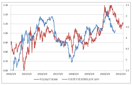 图:科技50指数和沪深300的比值与国开债利率的走势