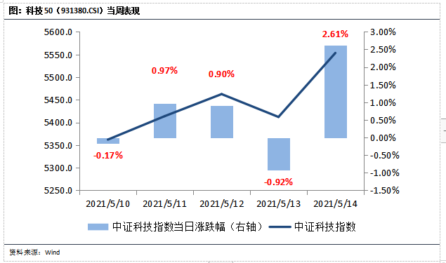 上周中证科技指数持续上涨,全周涨跌幅为3.39%,跑赢沪深300指数1.1%