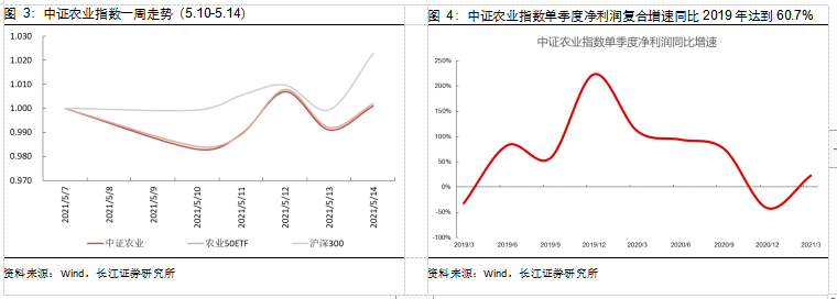 年报方面,中证农业整体的净利润同比增速为39.59%;一季报方面,中证农业整体的净利润(2019年为基准)复合增速为60.74%。