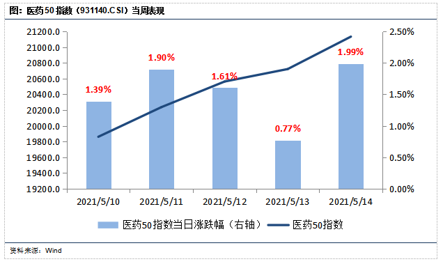 上周医药50指数一路上涨,周涨幅达到7.9%,跑赢沪深300指数5.6%。