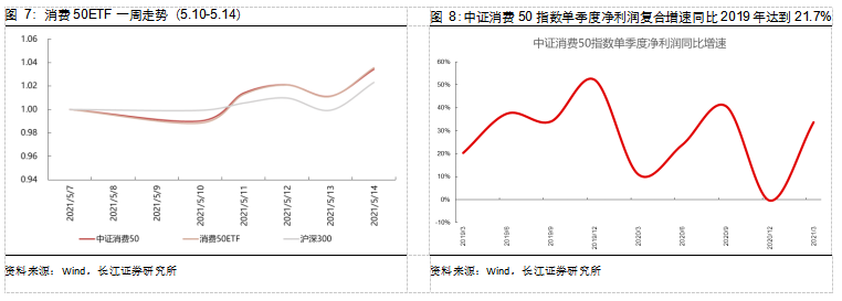 年报方面,消费50指数净利润同比增速为17.66%;一季报方面,消费50指数整体的净利润(2019年为基准)复合增速为21.74%。