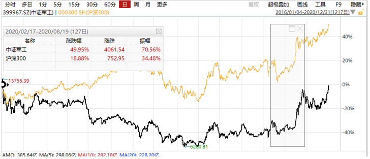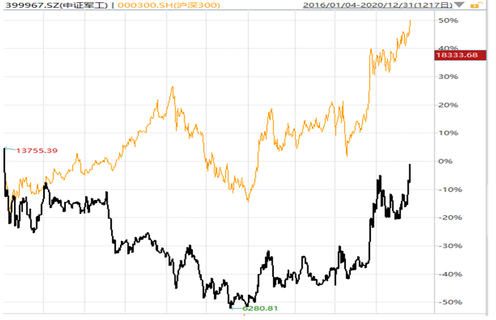 图:中证军工指数(黑色)与沪深300指数(黄色)历史走势对比