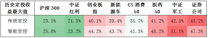 下表数据表明:无论是智能定投还是传统定投,中证军工的定投最高收益率,大幅高于其他行业指数。