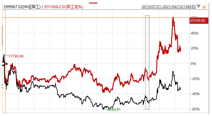 图:军工龙头指数(红色)与中证军工指数历史走势对比