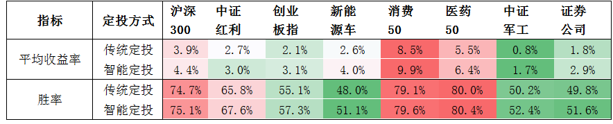 统计如下:从2016年开始,如果每天都开启一场6个月的定投计划,分别定投包括沪深300、中证红利、军工、消费、证券等在内的多类标的,收益表明:无论你使用传统定投方式、还是优化后的智能定投方式,军工指数的平均收益率、胜率都是垫底的。
