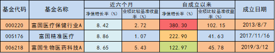 这三只成立时间超过2年的医药主题基金,成立时间越久,业绩表现更坚挺,其中,富国医疗保健行业自2013年8月成立至今,净值增长率超380%,同期业绩比较基准收益率为102%;2017年11月成立的富国精准医疗,自成立以来收益率近223%,同期业绩比较基准收益率为42%,富国生物医药科技自2019年3月成立至今,收益率近123%,同期业绩比较基准收益率近46%。三只医药主题类基金均有明显的超额收益,越是经过时间洗涤,超额收益更显著。