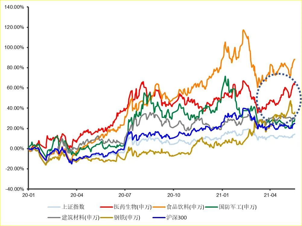 再看看它最近的表现,在市场震荡调整的几个月里,申万一级行业中,仅2个指数表现有企稳回弹的迹象,如图所示,即食品饮料、医药生物两大指数。
