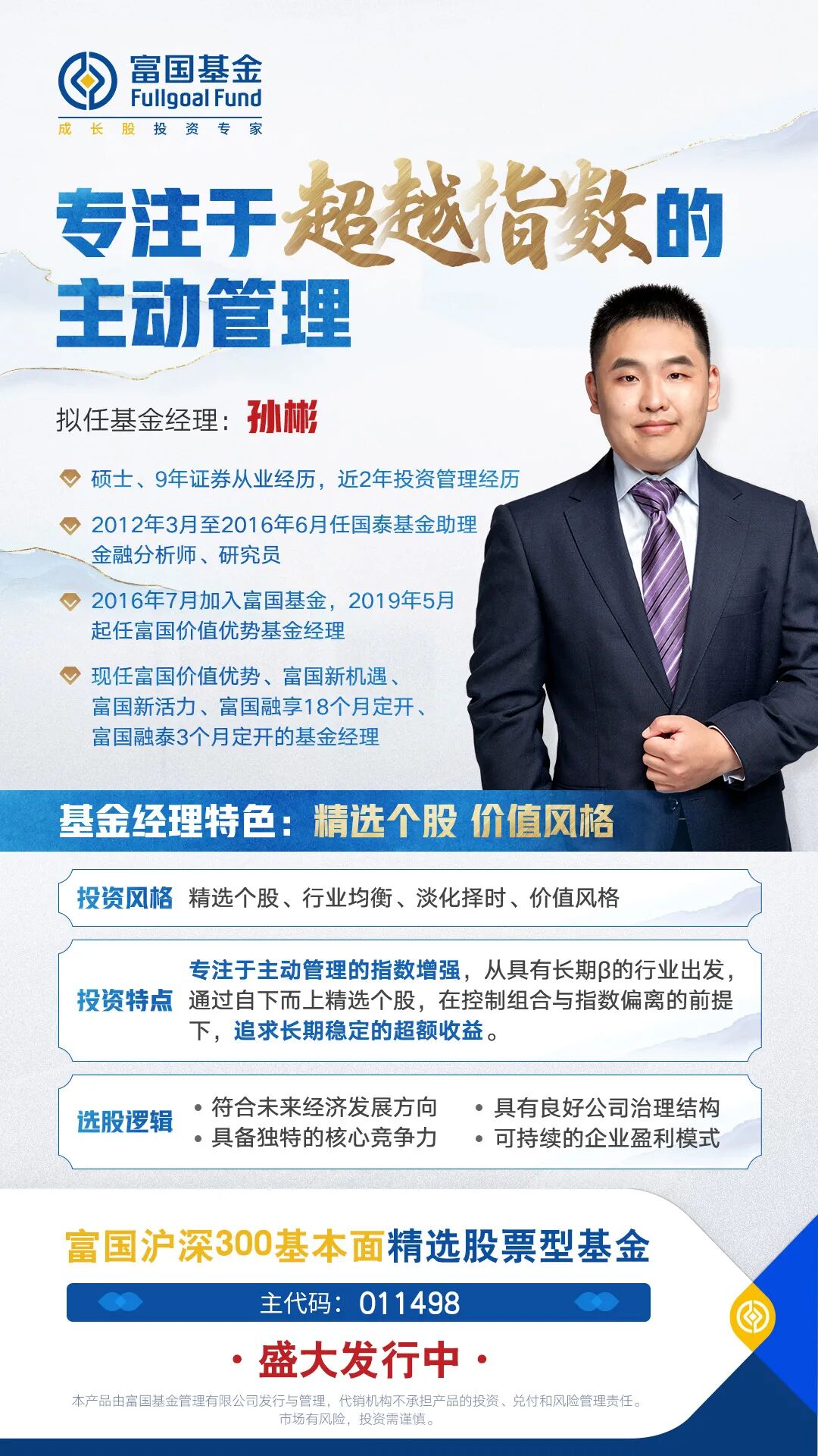 当下,拟由孙彬管理的新产品富国沪深300基本面精选(主代码:011498)正在发行中,新产品延续了孙彬专注于超越指数的主动管理的投资风格,以沪深300全收益指数成份股为主要筛选池,拟通过行业配置和个股精选相结合的基本面增强方式,致力通过主动管理实现稳健超越业绩比较基准的长期回报,感兴趣的客官可以点击下方“阅读原文”了解更多产品信息~