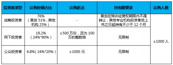 按照规则要求,原始权益人首创股份参与战略配售拟认购本次募集基金份额的51%,且在本基金投资之深圳基础设施项目和合肥基础设施项目的特许经营权期限内(以届时存续的前述基础设施项目的特许经营权到期日孰晚为准)不得转让,基金份额持有期间不允许质押;其他专业机构投资者参与战略配售拟认购本基金份额的25%,且持有自上市之日起不少于12个月;本基金网下发售比例为基金募集份额扣除战略投资者配售部分后的80%,剩余部分面向公众投资者发售。