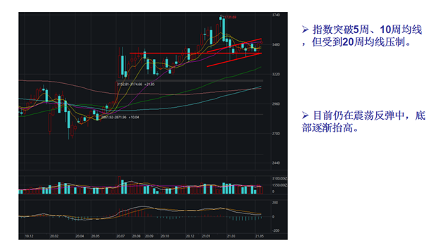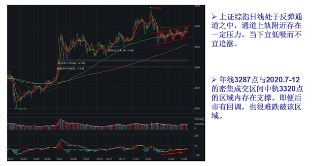 从日线来看,上证指数日线处于反弹通道中,通道上轨附近存在一定压力。当下适宜低吸而不是追涨。年线3287点与2020.7-12月的密集成交区间中轨3320点的区域内存在支撑。即使后市有回调,也难跌破该区域。
