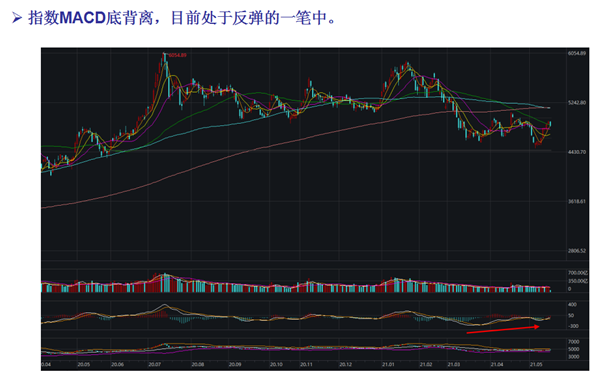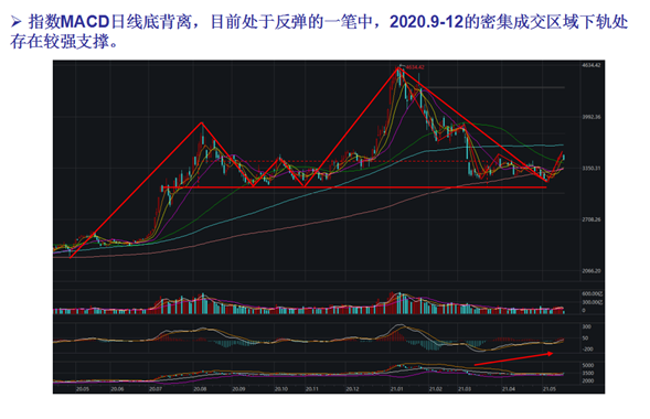军工龙头指数MACD日线顶背离,目前处于反弹的一笔中,2020.9-12月的密集成交区域下轨处存在较大强支撑。军工5月25日单日涨幅较大,涨幅能否持续主要得看军工回调的幅度。由于军工龙头的反弹是要晚于其他指数,后续可能有补涨空间。