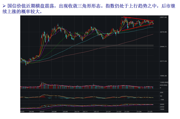 首先是国信价值,从技术指标来看,国信价值近期横盘震荡,出现收敛三角形形态。指数仍处于上行趋势之中,后市继续上涨的概率较大。