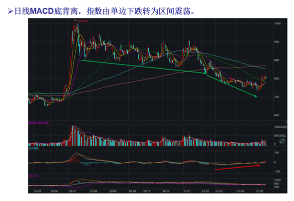 证券公司日线MACD底背离,指数由单边下跌转为区间震荡。