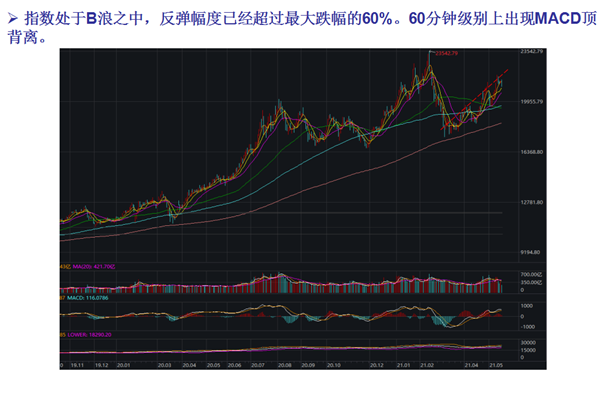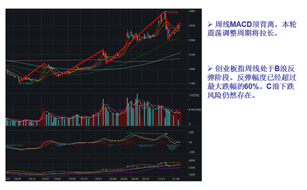 从3月下旬反弹以来,成长风起创业板指表现迅猛,区间涨幅已超过20%。从技术层面来看,创业板指周线MACD顶背离,意味着本轮震荡调整周期将拉长。同时其周线处于B浪反弹阶段。反弹幅度已经超过最大跌幅的60%。C浪下跌风险依然存在。