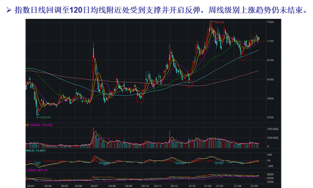 中证银行指数日线回调至120日均线附近受到支撑并开启反弹,周线级别上涨趋势仍未结束。