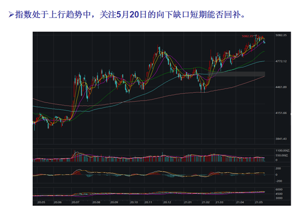 另外,我们看一下中证红利指数,指数处于上行趋势中,关注5月20日的向上缺口能否回补。