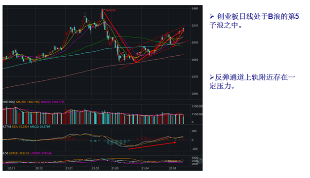 从日线来看,创业板指处于B浪的第5子浪之中,反弹通道上轨附近存在一定压力。从性价比来看,上证指数反弹幅度低于创业板指,上证指数还有更多的空间。由于创业板指前期套牢盘比较多,所以压力比上证指数要大。