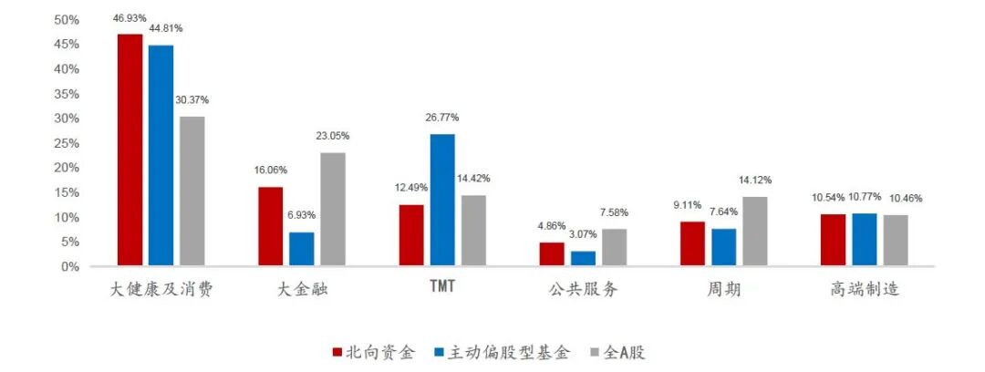 北向资金最爱大消费,接近一半的资金都配置在大消费中;