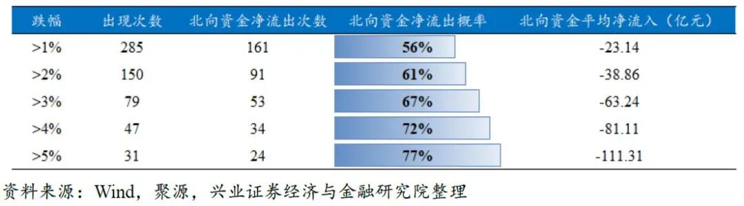 举个例子:历史上标普500指数周跌幅超过5%的情景下,下一周里,北向资金净流出概率高达77%,而且平均净流出金额高达111亿元。