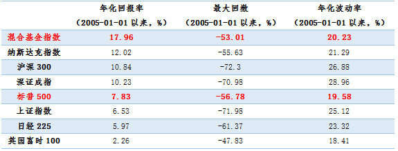 对于巴菲特多年来持续荐的标普500,其实在过去15年间整体表现远逊于A股市场的混合基金指数(综合反应国内市场主动管理的所有混合基金的整体走势)。从年化收益率、年化波动率、以及2005年以来的最大回撤看,国内市场混合基金指数在大幅跑赢标普500指数的同时,回撤控制能力同样不输标普500。这意味着,如果长期投资,只要选择稳定处于市场平均水平的混合基金,在历史上能够持续稳定跑赢标普500指数的,这从富国天惠、富国天合、富国天益等一系列老基金的表现可见一斑。