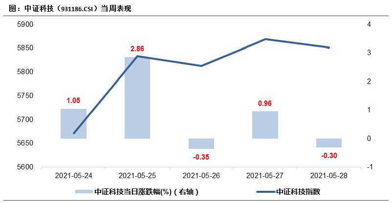 上周中证科技指数波动上行,全周涨跌幅为4.26%,周三、周四小幅下跌,跌幅分别为-0.35%、-0.30%,周一、周二、周四录得上涨,涨幅分别为1.05%、2.86%(最大涨幅)、0.96%。收于5851.91。